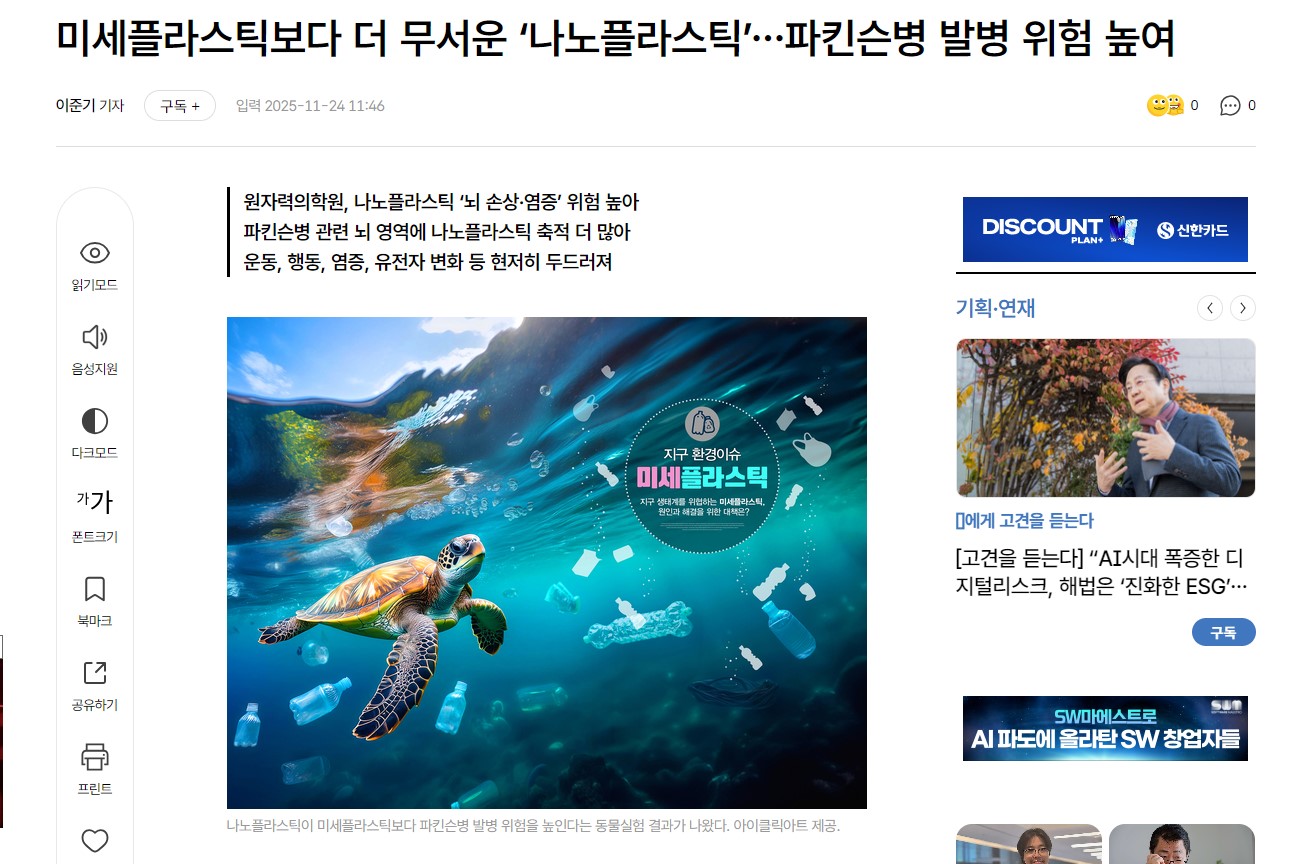 제목 : "미세플라스틱보다 더 무서운 '나노플라스틱' 파킨슨병 발병 위험 높여"